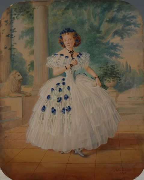 | Junge Dame vor Schloßlandschaft mit Wasserbrunnen im romantischem "Sissi Stil" | |