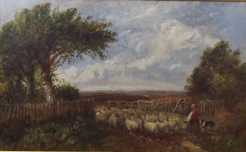 a rural scene with a flock of sheep, and a woman with a basket and sheepdog