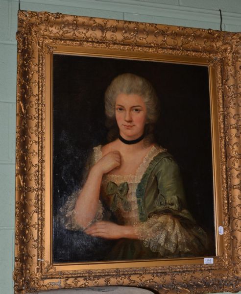 | A head and shoulders portrait of a fashionable lady wearing a powdered wig and blue silk dress trimmed with white lace | |