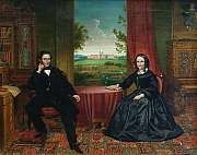 | 'Portrait of John Henry Hakewill and his wife, seated in their library, their stable block visible through the window' | |