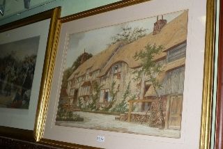 Timbered thatched cottages, possibly Anne Hathaway's, with crazy paved foreground