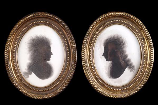 | A pair of silhouettes of ladies in profile, wearing dresses and with long flowing hair | |