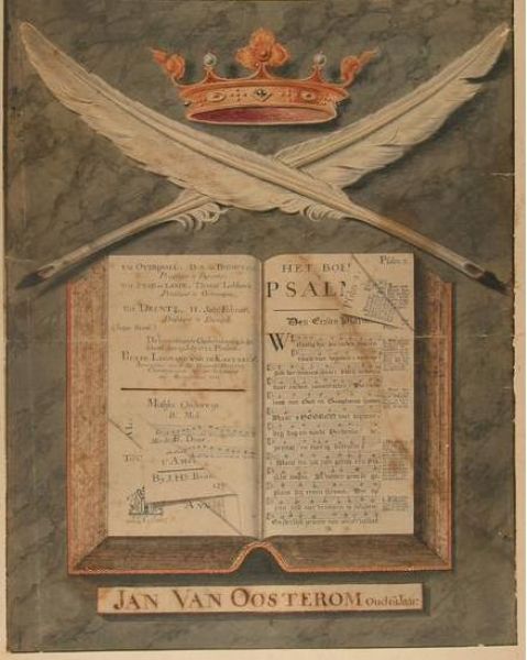 | Trompe l'oeil of a carving in marble of an opened psalmbook with crossed feathers and a crown above | |