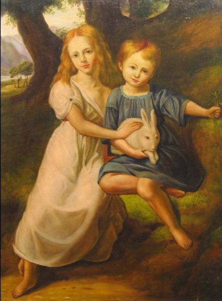 | portrait of two children depicted seated under trees, girl in white dress with blonde hair, the boy in blue frock holding a rabb | |