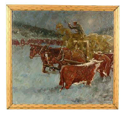 man forking hay to cattle from horse-driven cart on snowy day