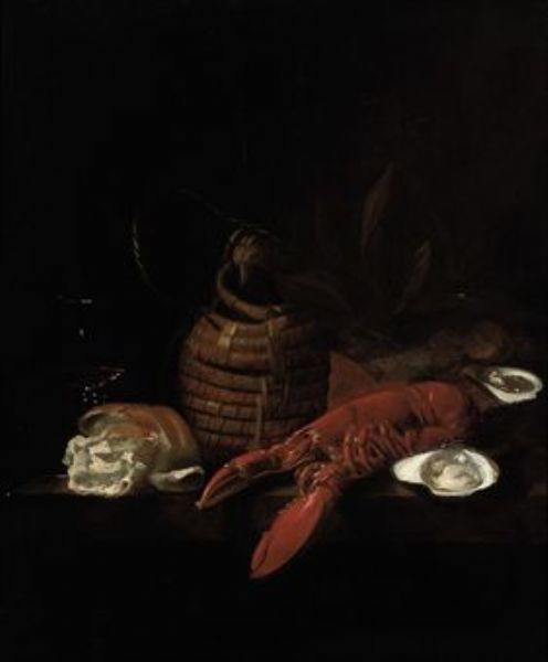 | A lobster, oysters, a bread roll, a wine glass and a glass jug on a ledge | |