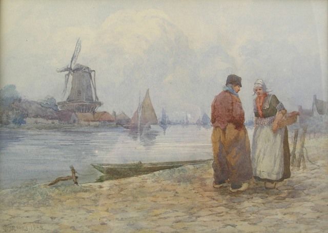 Dutch riverbank scene with two figures in the foreground, sailing boats and a windmill