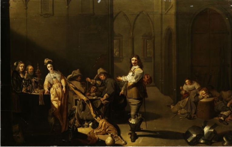 NOBEL GEKLEIDETER HERR MIT ERHOBENEM WEINGLAS, AUF DEN GELUNGENEN BEUTEZUG TRINKEND