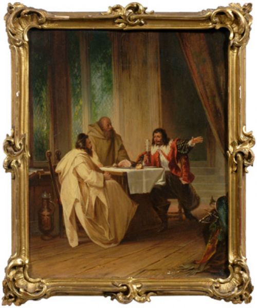 two monks at table with a cavalier