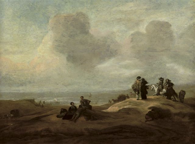 | Elegant figures in a dune landscape with the ocean beyond | |