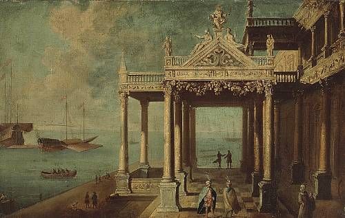 A capriccio view with figures conversing under the portico of a palace