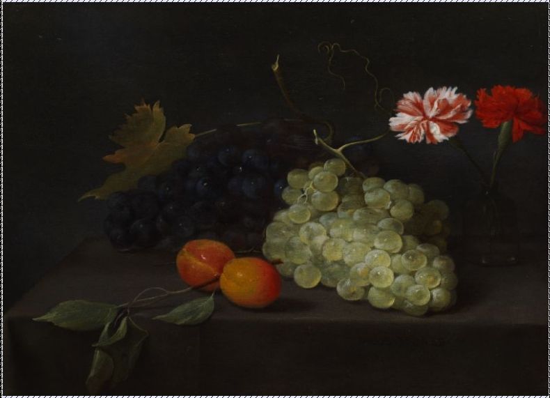STILLEBEN MIT HELLEN UND DUNKLEN TRAUBEN, MIT APRIKOSEN UND NELKEN