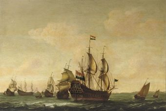 A man o' war with other shipping in choppy waters