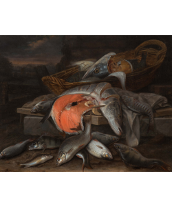 | Visstilleven met een snoek, een moot zalm en een mand op een stenen plint | |