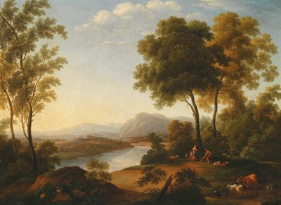 | Arcadian landscape with a river and an aqueduct in the background | |