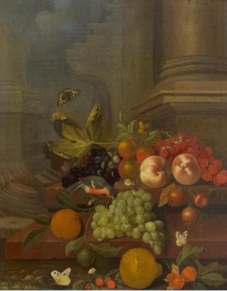 | Still life of fruits with grapes, peaches, an orange, a lemon, a bird and butterflies. | |
