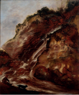 Mountain gorge, figure and dog in the foreground