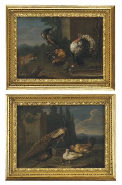 | A peacock, a peahen, a hen and a cockerel with chicks in an Italianate landscape; and A turkey, a cockerel and a peacock near a | |