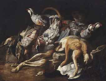 | A dead hare, partridges and other game on a stone ledge | |