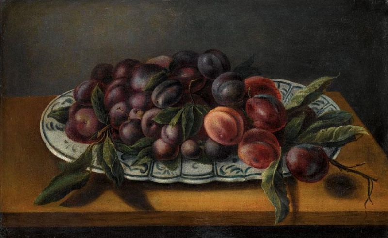 STILL LIFE WITH PLUMS IN A PORCELAIN BOWL ON A WOODEN TABLE