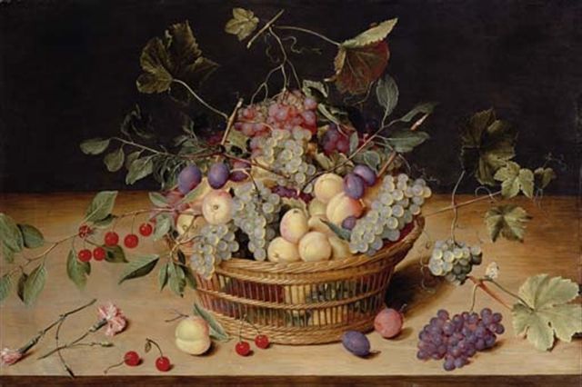| Plums, grapes, peaches and cherries in a basket and strewn on a ledge with carnations and a butterfly | |