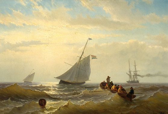Two fishing boats, a steamboat and men in a flat-boat on open sea