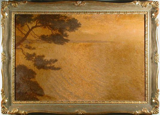 | Sonnenuntergang in einer südländischen Meeresbucht. Im Vordergrund die Äste einer Kiefer | |
