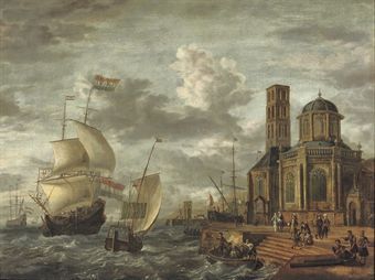 | A 'capriccio' view of a harbour with shipping near a large church | |