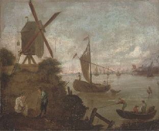 A river landscape with figures and boats by a windmill