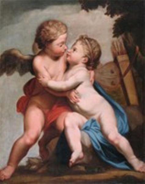 | wo Putti embracing each other in a landscape, a quiver of arrows rests on a rock nearby | |