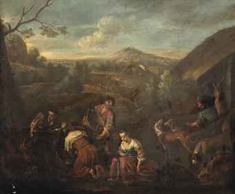 | An allegory of Spring: A hunter and his dogs and goatherds with their herd in a pastoral landscape | |