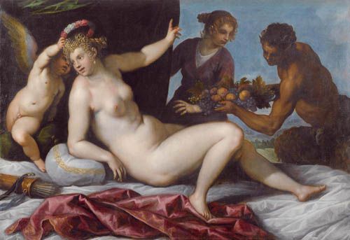 | Venus crowned by Cupid while satyrs and a nymph hand them fruits | |