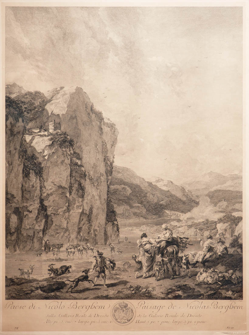 | Kupferstich nach einem Gemälde von Nicolas Berghem. Idealisierende Landschaft mit Burg, Viehherde und reicher Figurenstaffage | |