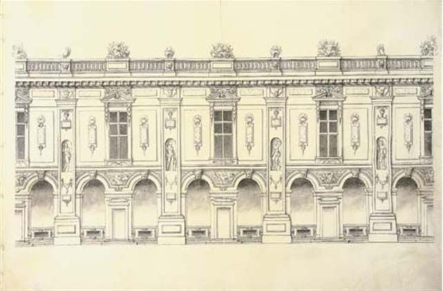 | A façade with a gallery above a colonnade articulated with pilasters set with cartouches containing nude warriors and decorated | |