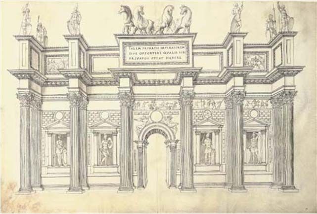 | A monumental gateway of five bays in the Corinthian Order, decorated with reliefs of military scenes and statues of warriors and | |