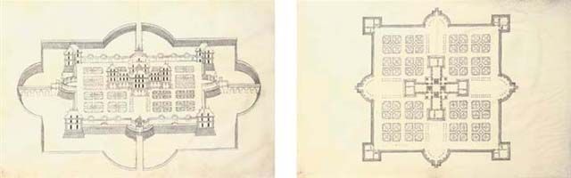 | The elevation of an elaborate cruciform palace set in formal gardens and surrounded by a moat; and A ground plan of the same pal | |