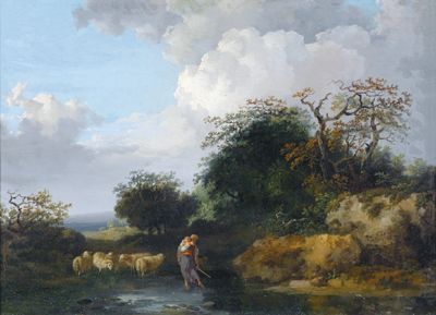 Wooded river landscape with a shepherdess and her flock