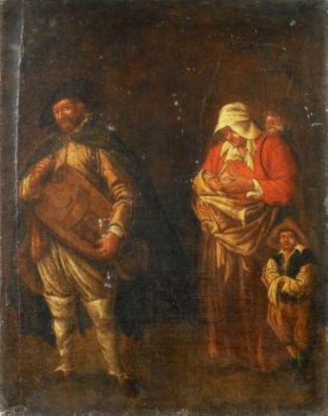 | Sänger mit einer Drehlaier (Ghironda) daneben eine Frau mit drei Kindern. | |