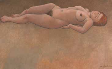 LAYING NUDE, RED HAIR, GR. BEIGE