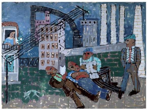 Hommes au repos lisant, chien et femme à sa fenêtre