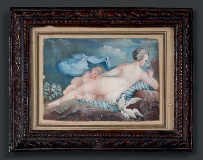 | Jeune femme dénudée alanguie, l'amour à ses côtés Miniature rectangulaire sur vélin | |
