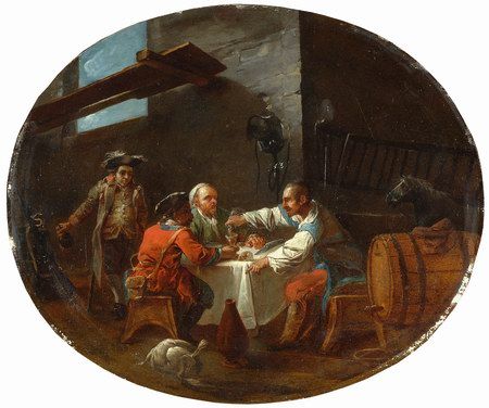 MILITAIRES ET PAYSANS ATTABLES DANS UNE ETABLE&