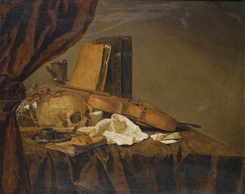 | A Vanitas with a skull, musical instruments, books, a letter and playing cards on a table top | |