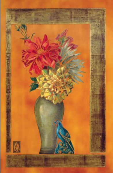 Bouquet de fleur et statuette dans un encadrement