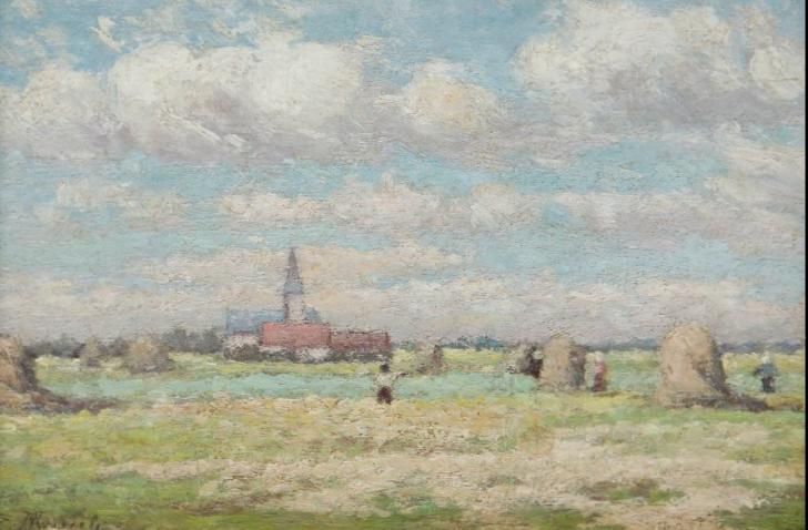 Summer landscape with haystacks and bell tower in the background