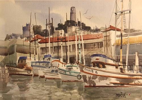 | Fishing boats at the wharf with Coit Tower in the distance | |
