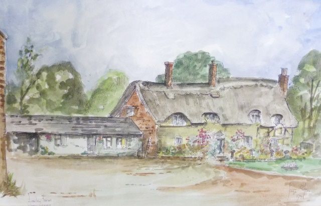 | Loxley Farm, Warwickshire, a thatched timbered building with trees beyond, pen and colour wash | |