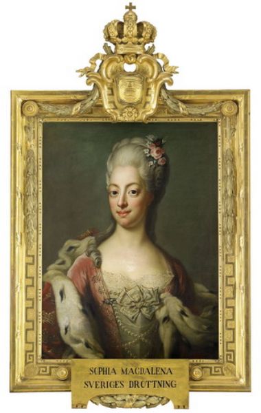 | Porträtt av drottning Sofia Magdalena iklädd röd klänning och hermelinmantel - midjebild | |