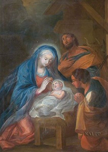 | Heilige Familie. Im Stall zu Bethlehem Maria sich zum Jesuskind vorbeugend und Josef den Blick zum Himmel wendend. | |