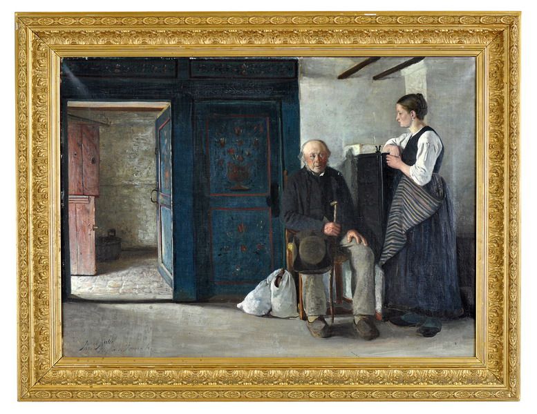 Stämningsfull allmogeinteriör med äldre man och kvinna